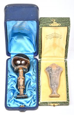 Twee lakzegelspempels in hun originele etui, een zilveren met Minerva hallmark en een verzilverde met marmeren bol.