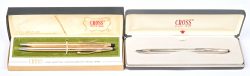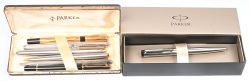 Een lot van balpennen, een viltstifthouder en een vulpen in twee etuis.