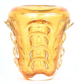 Een vaas van VSL kristal, geel in de massa gekleurd. Gemerkt; Val Saint Lambert.