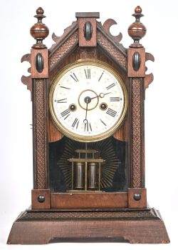 Een houten Victoriaanse tafelklok, architecturaal van opbouw. Gemerkt en achteraan genummerd 3033.