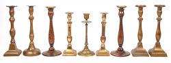 Negen diverse kandelaars, waarvan twee van gedraaid hout met messingen wasvang, de andere van messing. Einde XIXde tot medio XXste eeuw.