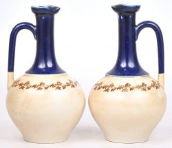 A pair of earthenware jugs with cobalt blue necks and a monochrome garland on the body. Marked at the bottom. Some chips on the spouts.Photos: 2Dim. H. 19.5 cm -