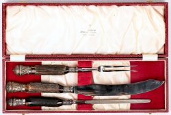 Een trancheerset met wetstaal, verzilverd metaal, inox en gewei.
