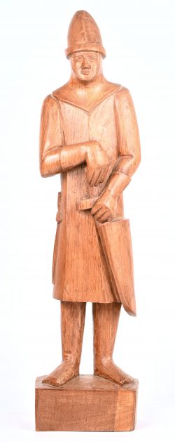 Een gesculpteerd eikenhouten beeld van “Jefke - de gemeentenaar”, gebaseerd op een middeleeuwse soldaat, symbool van het Gemeentekrediet. Gesigneerd.