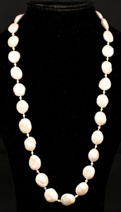 Een parelhalssnoer met witte barokparels en zilveren slot.