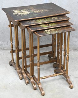 Een nest of tables. Vier goudkleurige houten tafeltjes met een decor van bloemen. Vroeg 20ste eeuw.