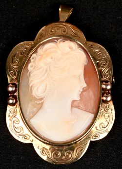 Een geelgouden hanger-broche bezet met een camee. 375 gemerkt.