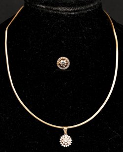 Een 18 kt wit en omkeerbare geelgouden halssnoer met hanger bezet met fantasiestenen. We voegen er een 18 kt witgouden oorbel bezet met briljanten met een gezamenlijk gewicht van +- 0,30 ct en 1,32 g aan toe.