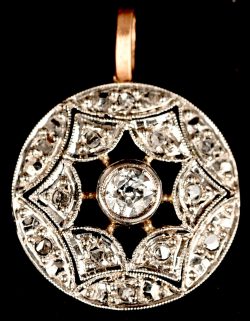 Een 18 kt wit- en geelgouden hanger bezet met diamanten oude slijp met een gezamenlijk gewicht van +- 0,30 ct.