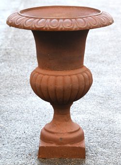 Een paar aardewerken tuinvaasjes met een ‘old paint’ patina. Toegevoegd een bolvormige kruik. Uit de collectie; House Of Porters.