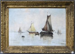 ‘Kleurrijk havenzicht’, ‘Zeilboten’ en ‘Heidelandschap’, een lot van drie olieverfschiderijen op paneel. Getekend L. Jordaens.