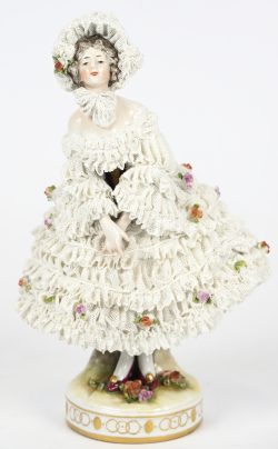 Een porseleinen beeldje van een dame, gemerkt Volkstedt-Rudolstadt, merkteken van de periode 1915 - 1934.