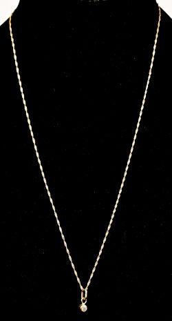Een 14 kt geelgouden fijne schakelketting met hanger bezet met een fantasiesteentje.