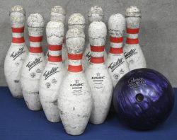 10 synthetische bowlingpins van Twister (Made in Germany, USBC certified) en een kleine bowlingbal (Columbia).