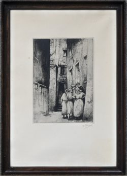 ‘Straatjesvolk’, een monochrome ets. Getekend binnen en buiten de plaat; K. Peiser.