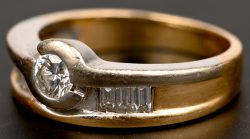 Een 18 kt wit-en geelgouden ring bezet met een centrale briljant van +- 0,20 ct. en baguettes met een gezamenlijk gewicht van +- 0,20 ct.