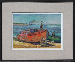 “Boten aan de oever.” Olieverf op paneel. Een impasto werk, medio 20ste eeuw. Onleesbaar gesigneerd.
