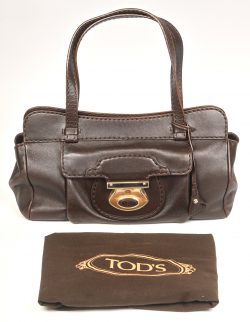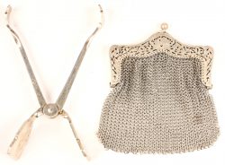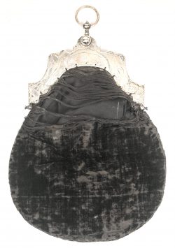 Een zwart handtasje met zilveren beugels. Met schade aan het textiel.