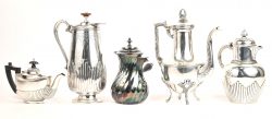 Een lot van vijf verzilverde koffie-, thee-en chocoladekannen.