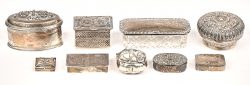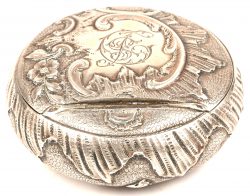 Een zilveren pillendoosje met een gedreven decor van rozen. Gemerkt; 800. Met een nettogewicht van 55 gram.