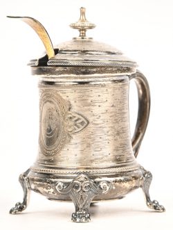 Een zilveren mosterdpotje met een verguld zilveren lepeltje. Het potje en de lepel dragen een monogram en zijn gemerkt 800M. Met een netto gewicht van 125 gram. Het glazen binnenpotje mist een chip aan de rand.