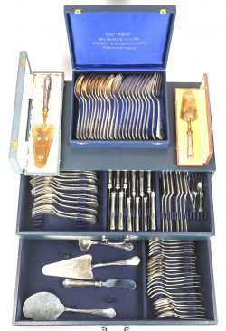 Een verzilverd Wiskemann bestek in casette van de ‘Fleury’ reeks. 12 tafelvorken en lepels. Van de overige stukken telkens 6 plus . Toegevoegd twee taartscheppen.