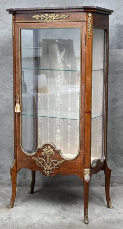 Een klassiek vitrinekastje in Transitionstijl met twee leggers en bovenop een marmeren blad. Ontbrekend glas aan de rechter zijkant.