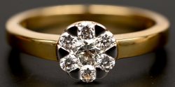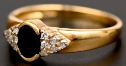 Een 18 kt geelgouden ring bezet met een centrale saffier van +- 0,20 ct. en 12 briljantjes.