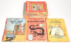 Een lot van zes oude Kuifje strips, hardcover. Het Zwarte Goud, Het Geheim van de Eenhoorn, Kuifje in Congo, Raket naar de Maan, 2 X De Blauwe Lotus. Met veel slijtage en sommige beschreven met balpen. Toegevoegd twee eerste drukken van de reeks Blake en Mortimer (Het Gele Teken en deel 2 van Het Geheim van de Grote Pyramide) en twee oude Suske & Wiske albums.