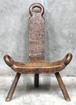Een massief houten melkstoeltje op drie poten, rustieke stijl.