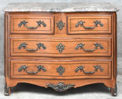 Een commode in Louis XV-stijl, marmeren blad en bronzen handvatten/beslag.