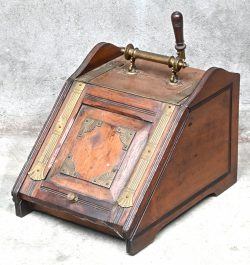 Een antieke kolenkit, hout met koperen beslag alsook de kolenschop.