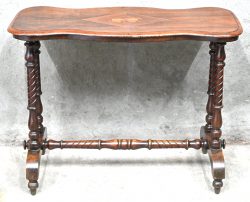 Een massief houten 19e eeuws Engels bijzettafeltje met inlegwerk in muzikaal thema.
