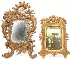 Een tafelspiegel met bronskleurige kader in Rococo stijl, toegevoegd een messing kader met oude foto.