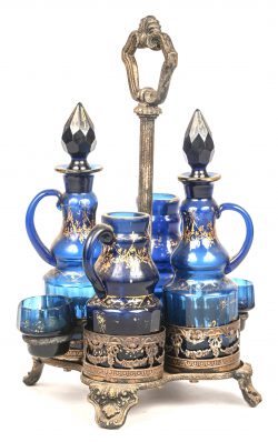Een likeurset, blauw glas met gouden accenten in verzilverd metalen houder, einde 19e eeuws.