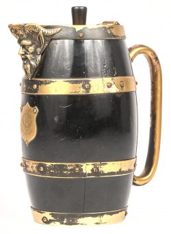 Een Victoriaanse schenkkan, hout en messing, met initialen GC en gedateerd 15th Dec. 1879.