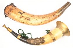 Twee hoornen bestaande uit een antieke (kruit?)-hoorn met initialen en metalen deksel en een toeter met bronzen plaatje met opschrift AOF.
