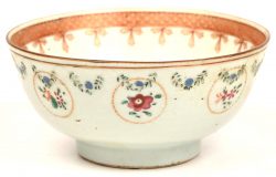 Een kommetje van meerkleurig 18e eeuws porselein. Met een decor van guirlandes en bloemen. Niet gemerkt.