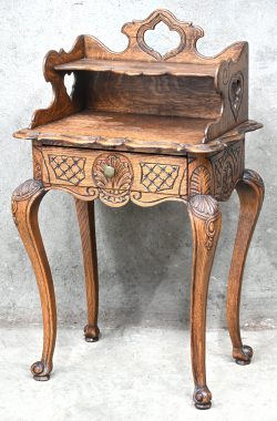 Een massief eikenhouten bijzetkastje met één lade en een schrijftabletje in Louis XV-stijl.