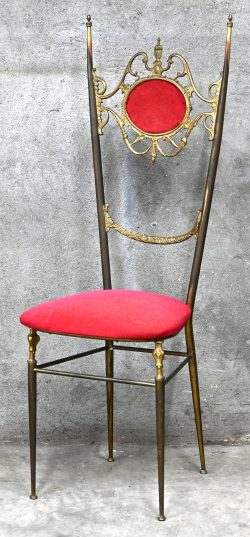 Een messingen stoeltje met rood fluwelen bekleding. Hollywood Regency stijl.