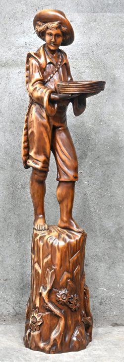 ‘Herdersjongen met mand’, een massief houten beeld.