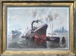 ‘Havenzicht’, olieverf op paneel. Getekend.
