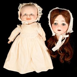 Twee poppen van kunststof. Eentje met slaapogen en traditionele klederdracht.
