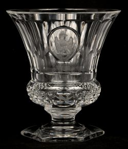 Een kleurloos geslepen kristallen vaas, met adelaar en markering ‘N’. Onderaan gemerkt.