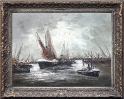 ‘Vrachtschip aan de kade’. Een monochrome ets door Eugeen Van Mieghem. Gemonogrammeerd binnen de plaat; EVM.