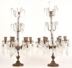 Een goudkleurige bronzen klok in barokke stijl, getooid met een putto met een zonnewijzer in de hand. Toegevoegd een paar messingen kandelaars gedragen door kariatiden. De achterplaat van de klok is manco.