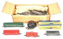 “American Flyer” een treinset bestaande uit een lot sporen, een seinpaal, 4 wagons en een transformator, meerdere originele verpakkingen aanwezig.
