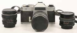 Een analoog fototoestel, Chinon CS, met 3 auto-chinon lenzen, 1:2.8 f=135mm, 1:2.8 f=35mm en 1:1.7 f=55mm.