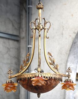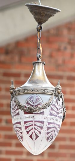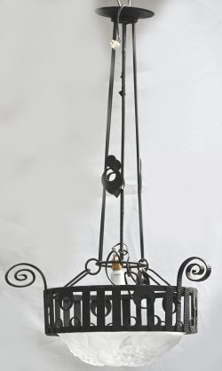 Een art deco luchter, smeedijzer en persglas. Het glas is gemerkt Ros.