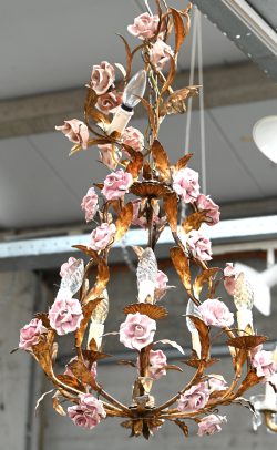 Een vintage luchter, verguld metaal en porseleinen roosjes, toegevoegd een bijbehorende applique.